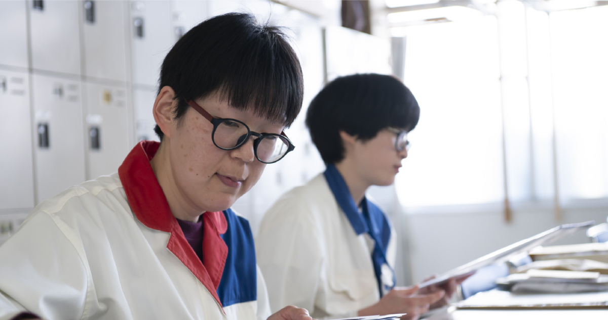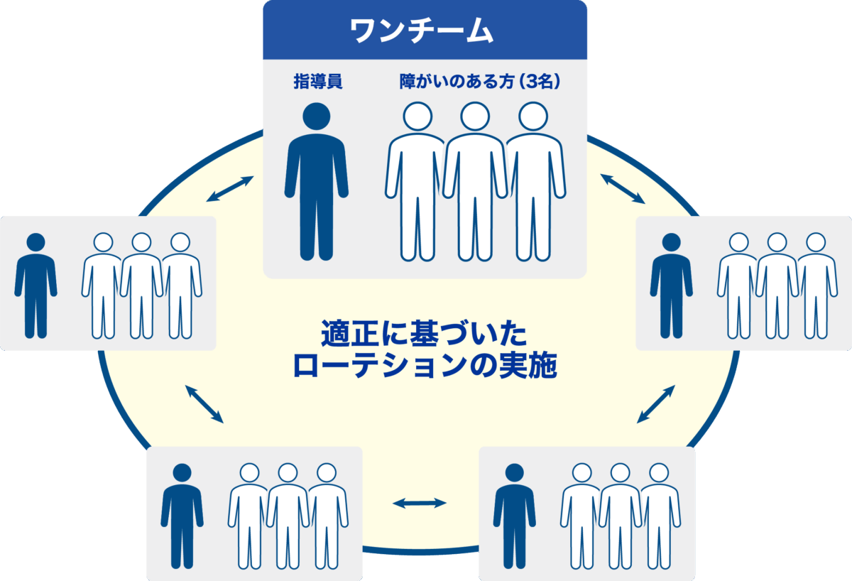 スズキ・サポートでは合理的配慮の観点から、障がいのある方3名と指導員1名が1つのチームになって仕事を行います。指導員のきめ細かい指示やサポートのもとで、安心・安全に仕事を行い、お互いを助け合う文化が生まれています。